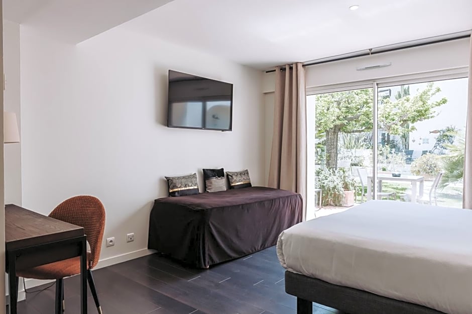 This room has a private terrace that offers direct access to the pool and garden.